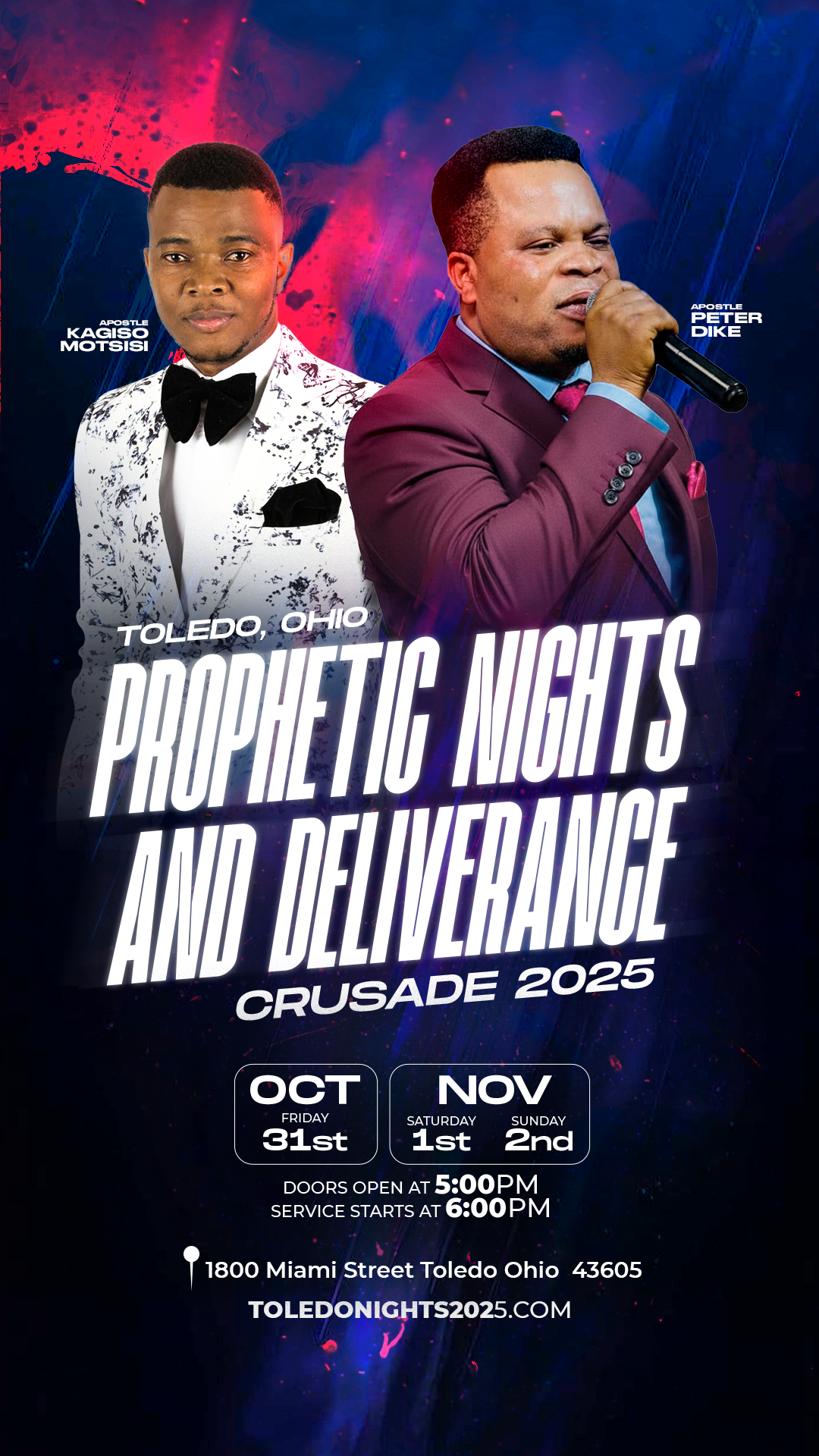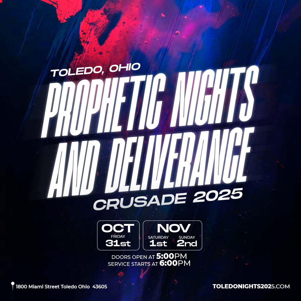 This is more than a service — it’s a defining moment set apart for transformation, renewal, and breakthrough. At the Toledo Prophetic Nights and Deliverance, we are believing for lives to be shifted, restored, and set into motion.